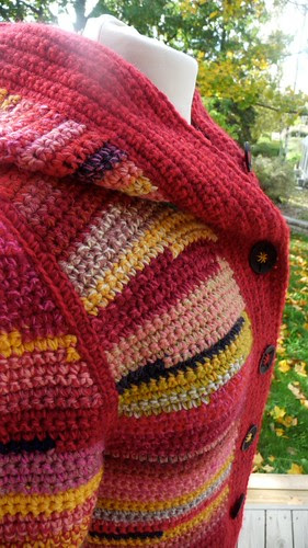 Vielä tähän takkiin olisi tarkoitus tehdä semmoiset päälle ommeltavat taskut (vaakaraidoin ja punaisella taskunsuulla).